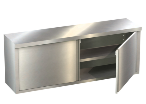 "longDescription": "<h2>Hängeschrank</h2><strong>mit durchgehender Wandbefestigungsschiene</strong><br><ul><li><strong>Solide und besonders stabil</strong> durch komplett verschweißte Konstruktion</li><li><strong>Rostfrei</strong> - aus Edelstahl (1.4301) mit matt geschliffener Oberfläche</li><li><strong>Individuelle Einrichtung</strong> dank höhenverstellbarem Fachboden</li></ul><br><strong>Sie haben die Wahl:</strong><br><ul><li><strong>Offen oder vor Staub geschützt geschlossen</strong> - wahlweise ohne Tür oder mit Schiebe- oder Doppelflügeltür</li></ul>",