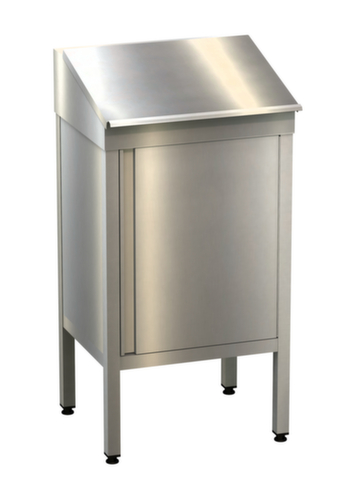 Konstruktion aus Edelstahl, verschweißt. Ausgestattet mit 1 schräge Schreibablage und 1 Schrank. Korpus mit einfacher Flügeltür.