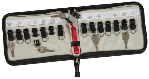"description": "f. Schlüssel, HxBxT 220x275x40mm, Polyester, schwarz/rot, m. Reißverschluss",