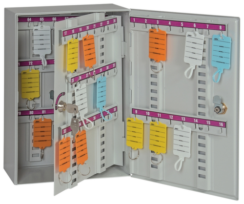 Ausgestattet mit individuell verstellbarer, fortlaufend nummerierter Hakenleiste für benutzerfreundliche Organisation der Schlüssel. Dank der Flügeltür haben Sie eine staubgeschützte Lagerung und Übersichtlichkeit in Einem. Verschließbar mit Zylinderschloss. Verriegelung 1-seitig. Konstruktion aus Stahlblech. Korpus mit schlag- und kratzfester Pulverbeschichtung in RAL7035 Lichtgrau. Front mit schlag- und kratzfester Pulverbeschichtung in RAL7035 Lichtgrau. Vorbereitet zur Rückwandverankerung.