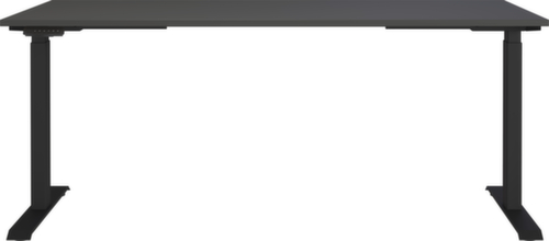 Platte aus Spanplatte mit pflegeleichter Melaminharzbeschichtung in Dekor graphit. Kante mit schlagfestem ABS-Umleimer, der vor unschönen Rissen und Ausbrechen schützt. T-Fußgestell aus Metall mit schlag- und kratzfester Pulverbeschichtung in schwarz. Höhenverstellung durch Elektromotor. Funktionen: Abspeichern und automatisches Abrufen von programmierten Tischhöhen dank Memoryfunktion. Gestell mit nivellierbaren Kunststoffgleitern, mit denen sich Bodenunebenheiten optimal ausbessern lassen. Mit Stromkabel, Stecker und Bedieneinheit elektrifizierbar.