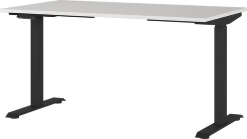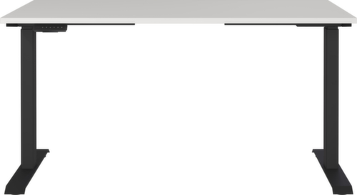 Platte aus Spanplatte mit pflegeleichter Melaminharzbeschichtung in Dekor lichtgrau. Plattenform eckig. Kante Alle Kanten sind durch schlagfeste ABS-Umleimer vor unschönen Rissen und Ausbrechen geschützt. C-Fußgestell aus Metall mit schlag- und kratzfester Pulverbeschichtung in schwarz. Höhenverstellung durch 2 Elektromotoren unterstützen Sie bei einer komfortablen Höhenverstellung auf Knopfdruck. Der automatische Kollisionsschutz stoppt sofort bei Widerstand von oben oder unten und sorgt somit für absolute Sicherheit. Gestell mit Kunststoffgleiter.