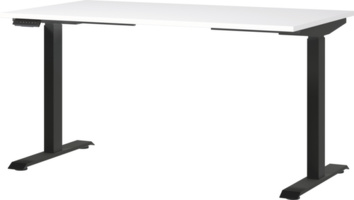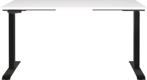 Platte aus Spanplatte mit pflegeleichter Melaminharzbeschichtung in Dekor weiß. Plattenform eckig. Kante Alle Kanten sind durch schlagfeste ABS-Umleimer vor unschönen Rissen und Ausbrechen geschützt. C-Fußgestell aus Metall mit schlag- und kratzfester Pulverbeschichtung in schwarz. Höhenverstellung durch 2 Elektromotoren unterstützen Sie bei einer komfortablen Höhenverstellung auf Knopfdruck. Der automatische Kollisionsschutz stoppt sofort bei Widerstand von oben oder unten und sorgt somit für absolute Sicherheit. Gestell mit Kunststoffgleiter.