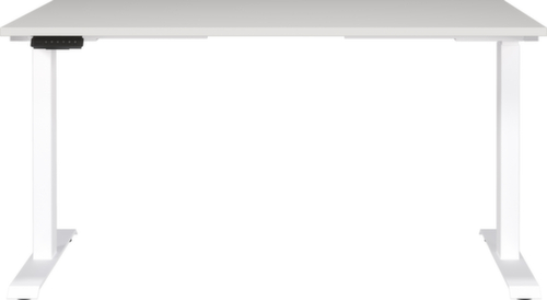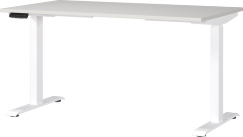 Platte aus Spanplatte mit pflegeleichter Melaminharzbeschichtung in Dekor lichtgrau. Plattenform eckig. Kante Alle Kanten sind durch schlagfeste ABS-Umleimer vor unschönen Rissen und Ausbrechen geschützt. C-Fußgestell aus Metall mit schlag- und kratzfester Pulverbeschichtung in weiß. Höhenverstellung durch 2 Elektromotoren unterstützen Sie bei einer komfortablen Höhenverstellung auf Knopfdruck. Funktionen: Abspeichern und automatisches Abrufen von programmierten Tischhöhen dank Memoryfunktion. Der automatische Kollisionsschutz stoppt sofort bei Widerstand von oben oder unten und sorgt somit für absolute Sicherheit. Gestell mit Kunststoffgleiter. Mit Stromkabel, Stecker und Bedieneinheit elektrifizierbar.
