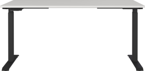 Platte aus Spanplatte mit kratzfester und pflegeleichter Melaminharzbeschichtung in Dekor lichtgrau. Kante mit schlagfestem ABS-Umleimer, der vor unschönen Rissen und Ausbrechen schützt. Doppel-T-Fußgestell aus Metall mit schlag- und kratzfester Pulverbeschichtung in schwarz. Gestell mit nivellierbaren Kunststoffgleitern, mit denen sich Bodenunebenheiten optimal ausbessern lassen. Mit Stromkabel, Stecker und Bedieneinheit elektrifizierbar.