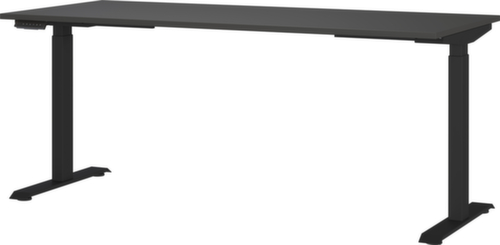 Platte aus Spanplatte mit kratzfester und pflegeleichter Melaminharzbeschichtung in Dekor graphit. Kante Alle Kanten sind durch schlagfeste ABS-Umleimer vor unschönen Rissen und Ausbrechen geschützt. T-Fußgestell aus Metall mit schlag- und kratzfester Pulverbeschichtung in schwarz. Gestell mit nivellierbaren Kunststoffgleitern, mit denen sich Bodenunebenheiten optimal ausbessern lassen. Mit Stromkabel, Stecker und Bedieneinheit elektrifizierbar.