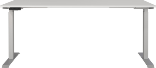 Platte aus Spanplatte mit pflegeleichter Melaminharzbeschichtung in Dekor lichtgrau. Kante mit schlagfestem ABS-Umleimer, der vor unschönen Rissen und Ausbrechen schützt. Doppel-T-Fußgestell aus Metall mit schlag- und kratzfester Pulverbeschichtung in silber. Gestell mit nivellierbaren Kunststoffgleitern, mit denen sich Bodenunebenheiten optimal ausbessern lassen. Mit Stromkabel, Stecker und Bedieneinheit elektrifizierbar.