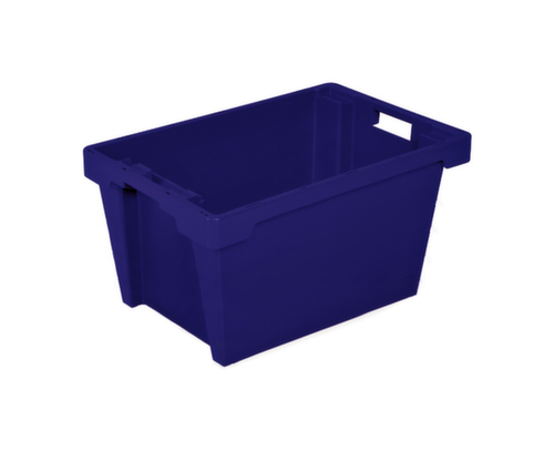 Aus schlagfestem Polyethylen in blau. Wände geschlossen, Boden geschlossen. Einfach zu tragen durch Durchfassgriffe. Durch eine 180°-Drehung ineinander schachtelbar. Lebensmittelgeeignet. Für Rollenbahnen geeignet. Temperaturbeständig von -40 °C bis +60 °C.