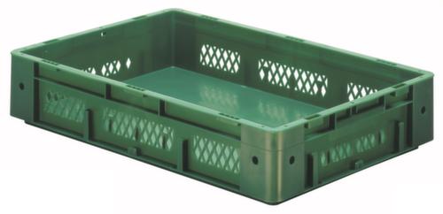 Maßlich auf die Europalette abgestimmt. Aus bruchsicherem Polypropylen in grün. Wände durchbrochen ohne Eingrifföffnung, Boden geschlossen. Boden mit Verstärkung durch Verstärkungsrippen. Einfacher Transport durch Tragegriffe. Mit Etikettenhalter an allen Seiten. Mehrfach stapelbar. Lebensmittelgeeignet. Für Rollenbahnen geeignet. Geeignet für verschiedene Stoffe, bitte anfragen.