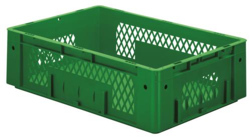 Maßlich auf die Europalette abgestimmt. Aus bruchsicherem Polypropylen in grün. Wände durchbrochen ohne Eingrifföffnung, Boden geschlossen. Boden mit Verstärkung durch Verstärkungsrippen. Einfacher Transport durch Tragegriffe. Mit Etikettenhalter an allen Seiten. Mehrfach stapelbar. Lebensmittelgeeignet. Für Rollenbahnen geeignet. Geeignet für verschiedene Stoffe, bitte anfragen.