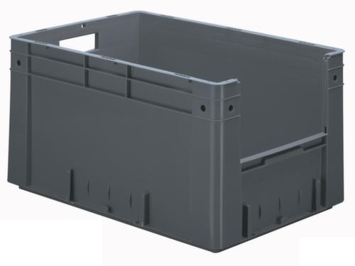 Maßlich auf die Europalette abgestimmt. Aus bruchsicherem Polypropylen in grau. Wände geschlossen mit stirnseitiger Eingrifföffnung, Boden geschlossen. Boden mit Verstärkung durch Verstärkungsrippen. Einfacher Transport durch Tragegriffe. Mit Etikettenhalter an allen Seiten. Mehrfach stapelbar. Lebensmittelgeeignet. Für Rollenbahnen geeignet. Geeignet für verschiedene Stoffe, bitte anfragen. recycelbar.
