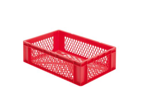 Maßlich auf die Europalette abgestimmt. Aus bruchsicherem Polypropylen in rot. Wände durchbrochen, Boden durchbrochen. Mehrfach stapelbar. Lebensmittelgeeignet. Für Rollenbahnen geeignet. Temperaturbeständig -20 °C bis +80 °C. Geeignet für verschiedene Stoffe, bitte anfragen.
