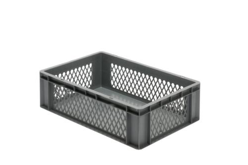 Maßlich auf die Europalette abgestimmt. Aus bruchsicherem Polypropylen in grau. Wände durchbrochen, Boden geschlossen. Mehrfach stapelbar. Lebensmittelgeeignet. Für Rollenbahnen geeignet. Temperaturbeständig -20 °C bis +80 °C. Geeignet für verschiedene Stoffe, bitte anfragen.