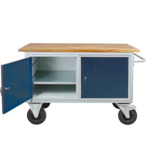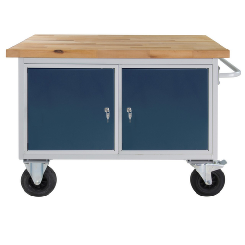 4 Rollen unter dem Gestell sorgen für die nötige Mobilität im Arbeitsalltag. Ausstattung: 2 Schränke, 2 Ablageböden. Flügeltür. Schiebebügel. Verschließbar mit Zentralverschluss. Türen separat verschließbar (gleichschließend). Konstruktion aus 30 x 30 mm Vierkantstahlrohr, verschweißt. Gestell mit schlag- und kratzfester Pulverbeschichtung in RAL7035 Lichtgrau. Front mit schlag- und kratzfester Pulverbeschichtung in RAL7016 Anthrazitgrau. Leicht zu manövrieren durch 2 Lenk- und 2 Bockräder. Die Feststeller an den Lenkrollen gewährleisten einen sicheren Stand. Rad Ø 200 mm.