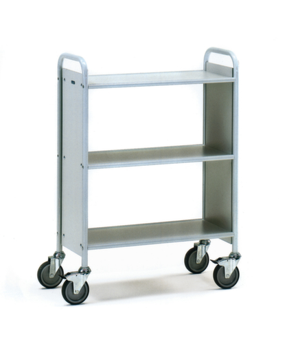 "longDescription": "<h2>Bürowagen</h2><strong>Traglast 150 kg</strong><br><ul><li>Verschraubte Stahlkonstruktion, pulverbeschichtet lichtgrau RAL 7035</li><li>Böden und Wände aus Holzwerkstoffplatte in hellgrau, Traglast je Boden 50 kg</li><li>Wahlweise mit 3 Etagen, 4, 6 oder 9 Fächern, alle Ausführungen mit oder ohne Rückwand</li><li>Teilweise mit geneigten Böden</li><li>4 Lenkrollen mit TPE-Bereifung, 2 Lenkrollen mit Feststeller, Naben mit Gleitlager</li></ul><br>Durch die Herstellung aus Stahl ist dieser Bürowagen <strong>stabil und sehr robust</strong> – darüber hinaus besitzt er eine pulverbeschichtete, schlag- und kratzfeste Oberfläche. Für einfache Lagerung sorgen 3 Plattformen. Durch Rollen mit TPE-Bereifung wird eine flexible Arbeitsweise ermöglicht. <br><ul><li>10 Jahre Garantie </li><li>Die Anlieferung erfolgt zerlegt </li><li>Genormt nach EN 1757-3 (Feststeller) </li></ul>",