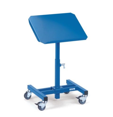 Plattform aus Stahl, mit Ablagekante. Stahlkonstruktion, verschweißt. Gestell mit schlag- und kratzfester Pulverbeschichtung in RAL5007 Brillantblau. Höhe 755 - 1105 mm. Ebenen im Raster von 25 mm verstellbar. Leicht zu manövrieren und verfahren durch 4 Lenkrollen, Feststeller an zwei Lenkrollen gewähren bei Bedarf stets einen sicheren Stand. Rad Ø 75 mm. Mit bodenschonender TPE-Bereifung. Naben mit stoßunempfindlichem und korrosionsbeständigem Gleitlager. Radanordnung rechteckig.