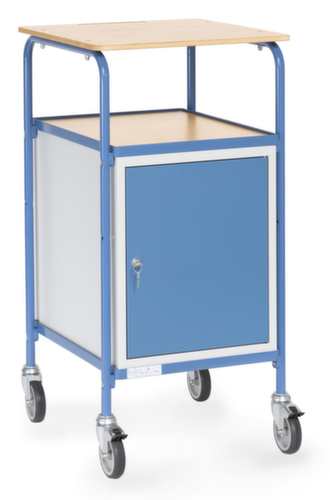 Konstruktion aus Stahlrohr, verschweißt. Ausgestattet mit 1 Schreibablage mit Stiftablage, 1 Boden und 1 abschließbarer Schrank. Traglast 100 kg.