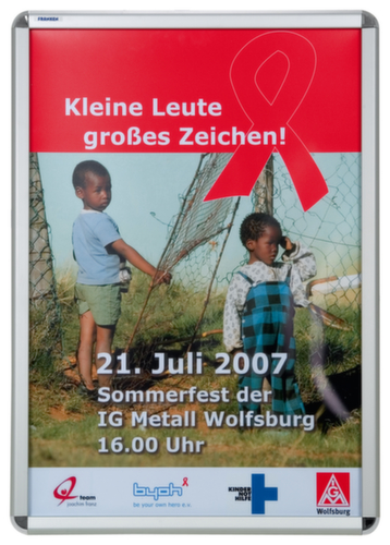 "longDescription": "<h2>Klapprahmen</h2><strong>Informationen gut geschützt präsentieren</strong><br><ul><li><strong>Modernes Design</strong> - Rahmen aus silbereloxiertem Aluminium mit glänzenden, abgerundeten Kunststoffecken</li><li><strong>Freie Sicht</strong> durch Antireflexfolie</li><li><strong>Verleiht Stabilität</strong> - Rückwand aus Polystyrol</li><li><strong>Passt an jede Wand</strong> - Montage im Hoch- oder Querformat möglich</li></ul><br>Dieser elegante Rahmen ist bestens geeignet für die Präsentation von Informationen und Bekanntmachungen, für Firmenporträts oder für besondere Fotoaufnahmen im Innenbereich. Mit der Klemmprofiltechnik können Sie die Inhalte schnell und einfach wechseln. Der Rahmen ist aus silbereloxiertem Aluminium mit glänzenden Kunststoffecken.<br><br>Mit der Antireflex-Schutzfolie sind Ihre Aushänge auch bei ungünstigem Lichteinfall gut zu sehen. Zusätzlich hat die Folie einen UV-Filter, welcher den Inhalt vor dem Ausbleichen schützt. Die Rückwand dieses Wechselrahmens ist aus stabilem Polystyrol.<br><br><strong>Gut zu wissen!</strong><br><br>Sie können den Rahmen im Hoch- und Querformat aufhängen. Sie benötigen für die Wandmontage Schrauben und Dübel (nicht im Lieferumfang enthalten).<br>",