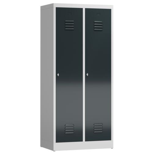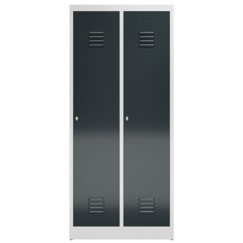 Je Abteil 1 Hutboden und 1 Kleiderstange mit 4 Doppelhaken. Flügeltür mit Lüftungsschlitzen. Verschließbar mit Drehriegelverschluss für Vorhängeschloss. Jedes Abteil einzeln verschließbar. Der untergebaute Sockel sorgt dafür, dass das Gewicht des Schrankes gleichmäßig auf dem Boden verteilt wird. Dies erhöht die Stabilität und der Schrank kann schwerer Lasten aufnehmen, als ein Schrank mit Füßen. Außerdem können Schmutz, Staub und Feuchtigkeit nicht unter den Schrank gelangen, was die Reinigungsfläche verkleinert. Konstruktion aus Stahl, verschweißt. Korpus mit elektrostatischer Pulverbeschichtung in RAL7035 Lichtgrau, Front mit elektrostatischer Pulverbeschichtung in RAL7016 Anthrazitgrau.