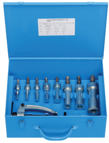 "value": "1.30/2 Innenauszieher 12-15 mm|1.30/3 Innenauszieher 15-19 mm|1.30/4 Innenauszieher 19-25 mm|1.30/4A Innenauszieher 25-30 mm|1.30/5 Innenauszieher 30-35 mm|1.30/6 Innenauszieher 35-45 mm|1.30/7 Innenauszieher 45-55 mm|1.30/8 Innenauszieher 55-70 mm|1.36/1 Gegenstütze für 1.30/0 - 1.30/5|1.36/2 Gegenstütze für 1.30/6 - 1.30/7|1.19/0XS Abzieher 3-armig XS Haken 50x70 mm|1.12/02 Polklemmenabzieher 2-armig 60x40 mm|1.06/1 Universal-Abzieher 2-armig 90x100 mm|1.06/2 Universal-Abzieher 2-armig 160x150 mm|1.28/1 Stehbolzenausdreher 6-13 mm|132/299B Blechkasten leer"