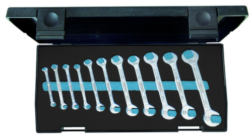 "longDescription": "• Inhalt 10-teilig: No. 8 4,5 5 5,5 6 7 8 9 10 11 12 13, Mit gleichen Schlüsselweiten, Maulstellung 15° und 75°, Chrom-Vanadium-Stahl 31CrV3, verchromt, Im Kunststoffkasten<br>",