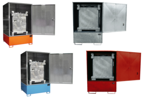 "metaDescription": "Gefahrstoff-Depot - für 4x200 l Fässer oder 1xKTC/IBC, Stahlblech, in verschiedenen Farben",