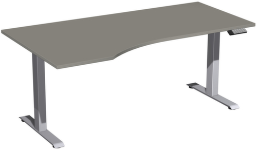 Die wichtigsten Maße des Gera Schreibtisches Elevate Basic auf einen Blick:Platte aus Holz mit pflegeleichter Melaminharzbeschichtung in Dekor Onyxgrau. Plattenform Freiform und damit besonders ergonomisch, da die Wölbung für eine größere Nähe zur Tischplatte beim Arbeiten sorgt. Vertiefung links. Kante mit schlagfestem ABS-Umleimer, der vor unschönen Rissen und Ausbrechen schützt. T-Fußgestell aus Stahl mit schlag- und kratzfester Pulverbeschichtung in silber. Rohrform Vierkantrohr. Höhenverstellung durch Elektromotor mit Handschalter. Funktionen: Abspeichern und automatisches Abrufen von 3 programmierten Tischhöhen dank Memoryfunktion. Der automatische Kollisionsschutz stoppt sofort bei Widerstand von oben oder unten und sorgt somit für absolute Sicherheit. Gestell mit Bodenausgleichsschrauben. USB-C-Anschluss zum Laden von Mobilgeräten vorhanden. Die Füße sind unter der Platte mit einer Traverse verbunden. Diese erhöht so die Gesamtstabilität des Tisches und ein Durchbiegen der Platte wird verhindert.