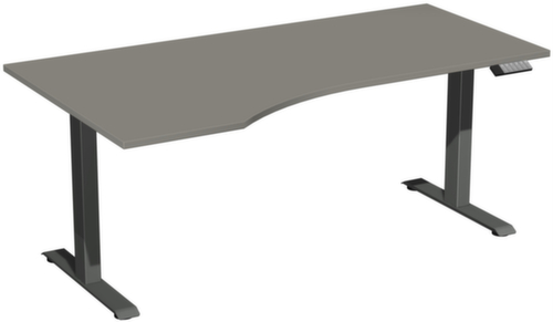 Die wichtigsten Maße des Gera Schreibtisches Elevate Basic auf einen Blick:Platte aus Holz mit pflegeleichter Melaminharzbeschichtung in Dekor Onyxgrau. Plattenform Freiform und damit besonders ergonomisch, da die Wölbung für eine größere Nähe zur Tischplatte beim Arbeiten sorgt. Vertiefung links. Kante mit schlagfestem ABS-Umleimer, der vor unschönen Rissen und Ausbrechen schützt. T-Fußgestell aus Stahl mit schlag- und kratzfester Pulverbeschichtung in anthrazit. Rohrform Vierkantrohr. Höhenverstellung durch Elektromotor mit Handschalter. Funktionen: Abspeichern und automatisches Abrufen von 3 programmierten Tischhöhen dank Memoryfunktion. Der automatische Kollisionsschutz stoppt sofort bei Widerstand von oben oder unten und sorgt somit für absolute Sicherheit. Gestell mit Bodenausgleichsschrauben. USB-C-Anschluss zum Laden von Mobilgeräten vorhanden. Die Füße sind unter der Platte mit einer Traverse verbunden. Diese erhöht so die Gesamtstabilität des Tisches und ein Durchbiegen der Platte wird verhindert.