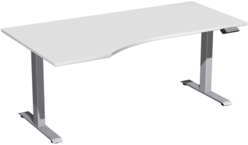 Die wichtigsten Maße des Gera Schreibtisches Elevate Plus auf einen Blick:Platte aus Holz mit pflegeleichter Melaminharzbeschichtung in Dekor lichtgrau. Plattenform Freiform und damit besonders ergonomisch, da die Wölbung für eine größere Nähe zur Tischplatte beim Arbeiten sorgt. Vertiefung links. Kante mit schlagfestem ABS-Umleimer, der vor unschönen Rissen und Ausbrechen schützt. T-Fußgestell aus Stahl mit schlag- und kratzfester Pulverbeschichtung in silber. Rohrform Vierkantrohr. Höhenverstellung durch Elektromotor mit Handschalter. Funktionen: Abspeichern und automatisches Abrufen von 3 programmierten Tischhöhen dank Memoryfunktion. Der automatische Kollisionsschutz stoppt sofort bei Widerstand von oben oder unten und sorgt somit für absolute Sicherheit. Gestell mit Bodenausgleichsschrauben. USB-C-Anschluss zum Laden von Mobilgeräten vorhanden. Die Füße sind unter der Platte mit einer Traverse verbunden. Diese erhöht so die Gesamtstabilität des Tisches und ein Durchbiegen der Platte wird verhindert.
