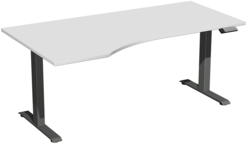 Die wichtigsten Maße des Gera Schreibtisches Elevate Plus auf einen Blick:Platte aus Holz mit pflegeleichter Melaminharzbeschichtung in Dekor lichtgrau. Plattenform Freiform und damit besonders ergonomisch, da die Wölbung für eine größere Nähe zur Tischplatte beim Arbeiten sorgt. Vertiefung links. Kante mit schlagfestem ABS-Umleimer, der vor unschönen Rissen und Ausbrechen schützt. T-Fußgestell aus Stahl mit schlag- und kratzfester Pulverbeschichtung in anthrazit. Rohrform Vierkantrohr. Höhenverstellung durch Elektromotor mit Handschalter. Funktionen: Abspeichern und automatisches Abrufen von 3 programmierten Tischhöhen dank Memoryfunktion. Der automatische Kollisionsschutz stoppt sofort bei Widerstand von oben oder unten und sorgt somit für absolute Sicherheit. Gestell mit Bodenausgleichsschrauben. USB-C-Anschluss zum Laden von Mobilgeräten vorhanden. Die Füße sind unter der Platte mit einer Traverse verbunden. Diese erhöht so die Gesamtstabilität des Tisches und ein Durchbiegen der Platte wird verhindert.