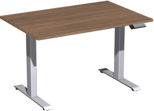 Die wichtigsten Maße des Gera Schreibtisches Elevate Basic auf einen Blick:Platte aus Holz mit pflegeleichter Melaminharzbeschichtung in Dekor Nussbaum. Plattenform eckig. Kante mit schlagfestem ABS-Umleimer, der vor unschönen Rissen und Ausbrechen schützt. T-Fußgestell aus Stahl mit schlag- und kratzfester Pulverbeschichtung in silber. Rohrform Vierkantrohr. Höhenverstellung durch Elektromotor mit Handschalter. Funktionen: Abspeichern und automatisches Abrufen von 3 programmierten Tischhöhen dank Memoryfunktion. Der automatische Kollisionsschutz stoppt sofort bei Widerstand von oben oder unten und sorgt somit für absolute Sicherheit. Gestell mit Bodenausgleichsschrauben. USB-C-Anschluss zum Laden von Mobilgeräten vorhanden. Die Füße sind unter der Platte mit einer Traverse verbunden. Diese erhöht so die Gesamtstabilität des Tisches und ein Durchbiegen der Platte wird verhindert.