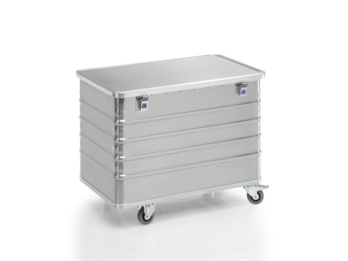 Wände mit umlaufenden Sicken. Deckel anscharniert. Aluminiumkonstruktion. 2 Lenk- und 2 Bockrollen. Rad Ø 100 mm. Mit Vollgummi-Bereifung. Naben mit Rollenlager. Rollen mit Fadenschutz, Lenkrollen mit Feststellern. Radanordnung rechteckig.