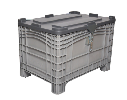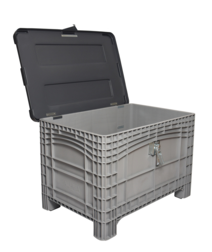 Maßlich auf die Europalette abgestimmt. Aus schlagfestem Polyethylen in grau. Das Lagergut lässt sich durch die geschlossenen Wände vor Staub geschützt lagern und der Behälter lässt sich leicht reinigen, mit Verstärkungsrippen. Zur einfachen Reinigung ist der Boden geschlossen. Staubgeschützt zu schließen über Scharnierdeckel. 4 Füße sorgen für einen sicheren Stand.