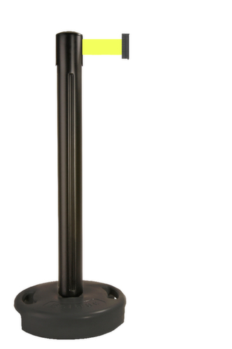 Die wichtigsten Maße des Absperrsystems auf einen Blick:Fuß in runder Ausührung. Zur Beschwerung kann dieser mit Beton oder Sand gefüllt werden. Für eine platzsparende Lagerung ist der Fuß zudem abnehmbar. Gurt in neongelb. Pfosten aus PVC in schwarz. Fuß aus PVC in schwarz.