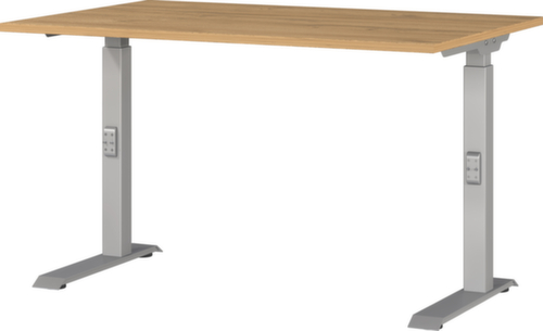 Platte aus Spanplatte mit pflegeleichter Melaminharzbeschichtung in Dekor Grandson-Eiche. Kante mit schlagfestem ABS-Umleimer, der vor unschönen Rissen und Ausbrechen schützt. C-Fußgestell aus Metall mit schlag- und kratzfester Pulverbeschichtung in silber. Höhenverstellung durch Mechanik. Gestell mit nivellierbaren Kunststoffgleitern, mit denen sich Bodenunebenheiten optimal ausbessern lassen.
