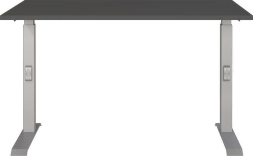Platte aus Spanplatte mit pflegeleichter Melaminharzbeschichtung in Dekor graphit. Kante mit schlagfestem ABS-Umleimer, der vor unschönen Rissen und Ausbrechen schützt. C-Fußgestell aus Metall mit schlag- und kratzfester Pulverbeschichtung in silber. Höhenverstellung durch Mechanik. Gestell mit nivellierbaren Kunststoffgleitern, mit denen sich Bodenunebenheiten optimal ausbessern lassen.