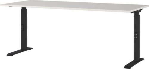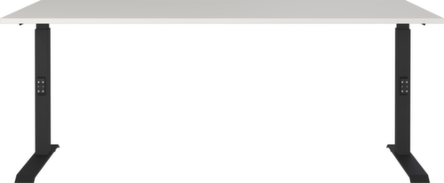 Platte aus Spanplatte mit kratzfester und pflegeleichter Melaminharzbeschichtung in Dekor lichtgrau. Kante Alle Kanten sind durch schlagfeste ABS-Umleimer vor unschönen Rissen und Ausbrechen geschützt. C-Fußgestell aus Metall mit schlag- und kratzfester Pulverbeschichtung in schwarz. Höhenverstellung durch Mechanik. Gestell mit nivellierbaren Kunststoffgleitern, mit denen sich Bodenunebenheiten optimal ausbessern lassen.