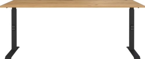 Platte aus Spanplatte mit kratzfester und pflegeleichter Melaminharzbeschichtung in Dekor Navarra-Eiche. Kante Alle Kanten sind durch schlagfeste ABS-Umleimer vor unschönen Rissen und Ausbrechen geschützt. C-Fußgestell aus Metall mit schlag- und kratzfester Pulverbeschichtung in schwarz. Höhenverstellung durch Mechanik. Gestell mit nivellierbaren Kunststoffgleitern, mit denen sich Bodenunebenheiten optimal ausbessern lassen.