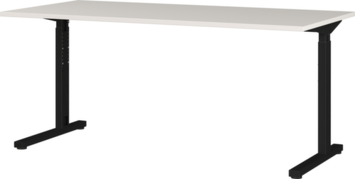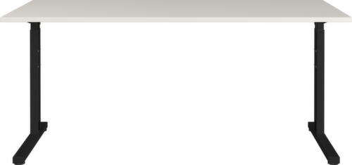 Platte aus Spanplatte mit pflegeleichter Melaminharzbeschichtung in Dekor lichtgrau. Plattenform rechteckig. Kante mit stoßfestem ABS-Umleimer. C-Fußgestell aus Metall mit schlag- und kratzfester Pulverbeschichtung in schwarz. Rohrform Rechteckrohr. Höhenverstellung durch Inbusschrauben. Gestell mit Nivelliergleiter.