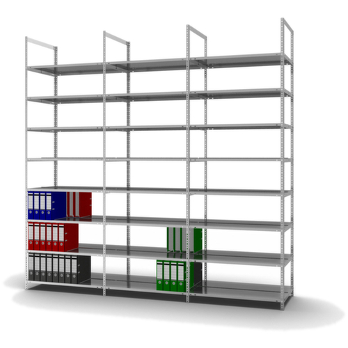 Die wichtigsten Maße des hofe Aktenregals auf einen Blick:8 Ebene(n) mit Böden aus Qualitätsfeinblech, ohne Abdeckboden / 8 Ordnerhöhen für 96 Ordner. Ebenen mit steckbarer Mittel-Anschlagkante und seitlicher Bodenabkantung der oberen Fachebene (ohne zusätzliche Streben) gegen das Herausfallen von Ordnern und gleichzeitig für unübertroffene Stabilität in der Längs- und Tiefenrichtung. Die Sicherheitskantung schützt zusätzlich vor Verletzungen beim Griff ins Regal. Nutzung beidseitig - flexible Aufstellung frei im Raum möglich. Konstruktion aus Stahl, Ständer mit korrosionsschützender Zinkbeschichtung, Ebenen mit korrosionsschützender Zinkbeschichtung.