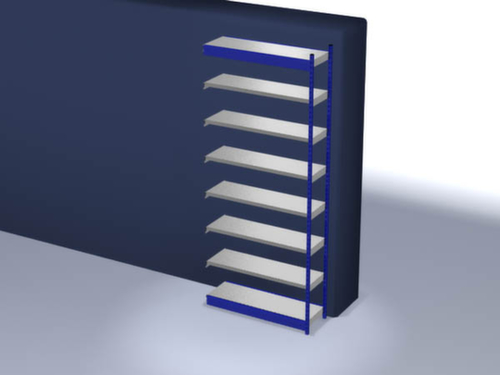 Die wichtigsten Maße des hofe Lagerregals auf einen Blick:7 Ebene(n) mit Stahlboden. Ebenen mit Sicherheitskantung zum Schutz vor Verletzungen. 3-fache Sicherheitsabkantung mit 40 mm Höhe sorgen für eine hohe Stabilität und Sicherheit gegen Verletzungen. Fachhöhen je nach Einsatzzweck und Ihrem Bedarf im Raster von 50 mm verstellbar. Aufstellwinkel gerade. Nutzung einseitig - zur Aufstellung an der Wand konzipiert. Hohe Stabilität durch Längstraversen. Konstruktion aus Stahl, Ständer mit strapazierfähiger Kunststoffbeschichtung in RAL5010 Enzianblau, Ebenen mit korrosionsschützender Zinkbeschichtung.