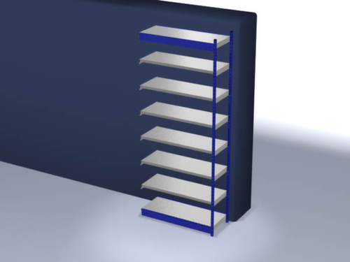 Die wichtigsten Maße des hofe Lagerregals auf einen Blick:7 Ebene(n) mit Stahlboden. Ebenen mit Sicherheitskantung zum Schutz vor Verletzungen. 3-fache Sicherheitsabkantung mit 40 mm Höhe sorgen für eine hohe Stabilität und Sicherheit gegen Verletzungen. Fachhöhen je nach Einsatzzweck und Ihrem Bedarf im Raster von 50 mm verstellbar. Aufstellwinkel gerade. Nutzung einseitig - zur Aufstellung an der Wand konzipiert. Hohe Stabilität durch Längstraversen. Konstruktion aus Stahl, Ständer mit strapazierfähiger Kunststoffbeschichtung in RAL5010 Enzianblau, Ebenen mit korrosionsschützender Zinkbeschichtung.