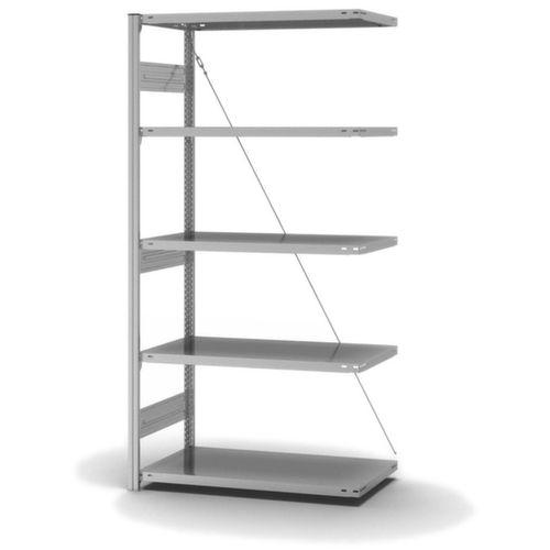 Anbauregal mit 1 Ständerrahmen, Diagonalverstrebungen und Ebenen gem. Angebot