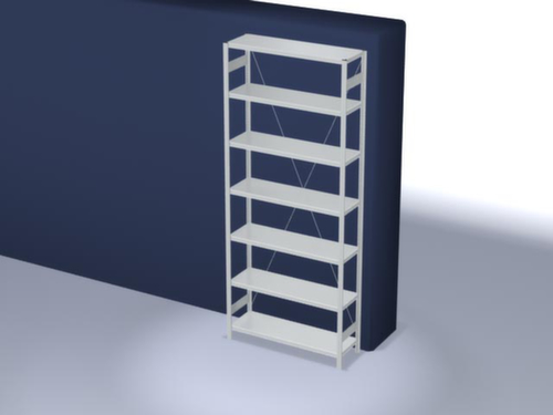 Die wichtigsten Maße des hofe Lagerregals auf einen Blick:7 Ebene(n) mit Stahlboden. Ebenen mit Sicherheitskantung zum Schutz vor Verletzungen. 3-fache Sicherheitsabkantung mit 40 mm Höhe und geschlossenen Eckbereichen sorgen für eine hohe Stabilität und Sicherheit gegen Verletzungen. Fachhöhen je nach Einsatzzweck und Ihrem Bedarf im Raster von 25 mm verstellbar. Aufstellwinkel gerade. Nutzung einseitig - zur Aufstellung an der Wand konzipiert. Hohe Stabilität in Längsrichtung durch Diagonalverstrebungen. Durch gesickte Tiefen-Verbindungsblechen und Stahl-Fußplatten ist das Regal besonders standfest. Obere Profilabdeckkappen sorgen für einen sauberen Abschluss. Konstruktion aus Stahl, Ständer verzinkt mit Kunststoffbeschichtung in RAL7035 Lichtgrau, Ebenen verzinkt mit Kunststoffbeschichtung in RAL7035 Lichtgrau.
