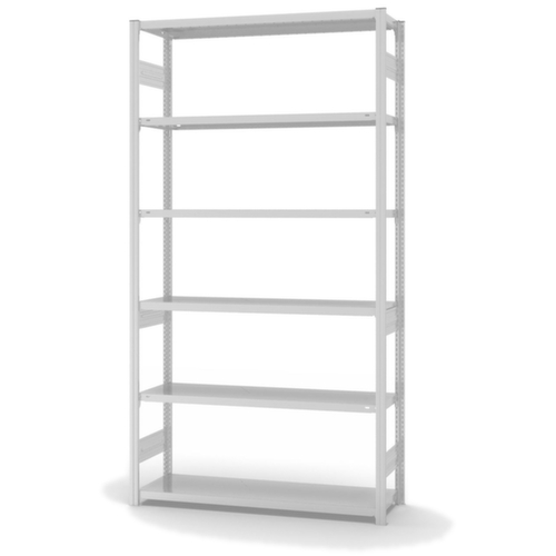 Die wichtigsten Maße des hofe Lagerregals auf einen Blick:6 Ebene(n) mit Stahlboden. Fachhöhen je nach Einsatzzweck und Ihrem Bedarf im Raster von 25 mm verstellbar. Aufstellwinkel gerade. Nutzung beidseitig - flexible Aufstellung frei im Raum möglich. Hohe Stabilität durch Aussteifungstraversen. Durch gesickte Tiefen-Verbindungsblechen und Stahl-Fußplatten ist das Regal besonders standfest. Obere Profilabdeckkappen sorgen für einen sauberen Abschluss. Konstruktion aus Stahl, Ständer verzinkt mit Kunststoffbeschichtung in RAL7035 Lichtgrau, Ebenen verzinkt mit Kunststoffbeschichtung in RAL7035 Lichtgrau.