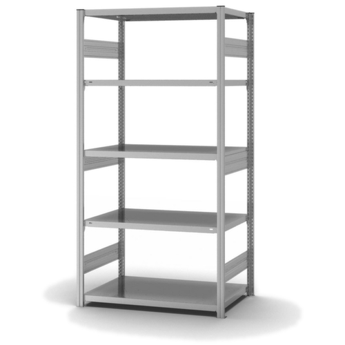Die wichtigsten Maße des hofe Lagerregals auf einen Blick:5 Ebene(n) mit Stahlboden. Fachhöhen je nach Einsatzzweck und Ihrem Bedarf im Raster von 25 mm verstellbar. Aufstellwinkel gerade. Nutzung beidseitig - flexible Aufstellung frei im Raum möglich. Hohe Stabilität durch Aussteifungstraversen. Durch gesickte Tiefen-Verbindungsblechen und Stahl-Fußplatten ist das Regal besonders standfest. Obere Profilabdeckkappen sorgen für einen sauberen Abschluss. Konstruktion aus Stahl, Ständer mit korrosionsschützender Zinkbeschichtung, Ebenen mit korrosionsschützender Zinkbeschichtung.