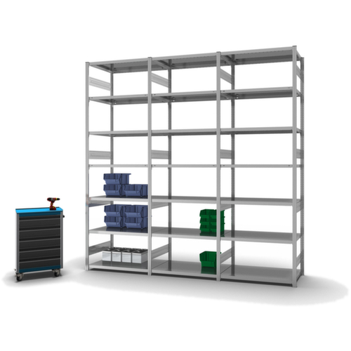 Für Ihre Sicherheit: nach DIN EN 15635 müssen Fachbodenregale ab einer 4-fachen Höhe zur Regaltiefe (Verhältnis 4:1) am Boden befestigt und gesichert werden. Die angegebenen Fachlasten gelten bei gleichmäßiger Lastverteilung. Zusätzliche Böden/Ebenen sind als Zubehör erhältlich und bis zur max. Feldlast erweiterbar.