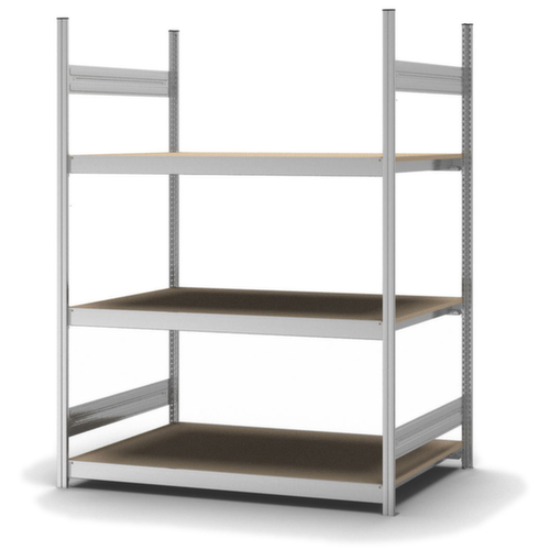 Die wichtigsten Maße des hofe Weitspannregals auf einen Blick:3 Ebene(n) mit Holzboden. Ebenen mit Verstärkung durch Unterzüge. Fachhöhen je nach Einsatzzweck und Ihrem Bedarf im Raster von 25 mm verstellbar. Nutzung einseitig - zur Aufstellung an der Wand konzipiert. Durch gesickte Tiefen-Verbindungsblechen und Stahl-Fußplatten ist das Regal besonders standfest. Obere Profilabdeckkappen sorgen für einen sauberen Abschluss. Konstruktion aus Stahl, Ständer mit korrosionsschützender Zinkbeschichtung, Traversen mit korrosionsschützender Zinkbeschichtung.