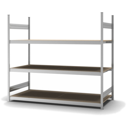 Die wichtigsten Maße des hofe Weitspannregals auf einen Blick:3 Ebene(n) mit Holzboden. Ebenen mit Verstärkung durch Unterzüge. Fachhöhen je nach Einsatzzweck und Ihrem Bedarf im Raster von 25 mm verstellbar. Nutzung einseitig - zur Aufstellung an der Wand konzipiert. Durch gesickte Tiefen-Verbindungsblechen und Stahl-Fußplatten ist das Regal besonders standfest. Obere Profilabdeckkappen sorgen für einen sauberen Abschluss. Konstruktion aus Stahl, Ständer mit korrosionsschützender Zinkbeschichtung, Traversen mit korrosionsschützender Zinkbeschichtung.