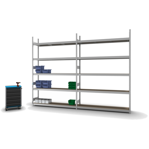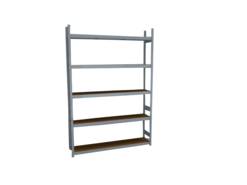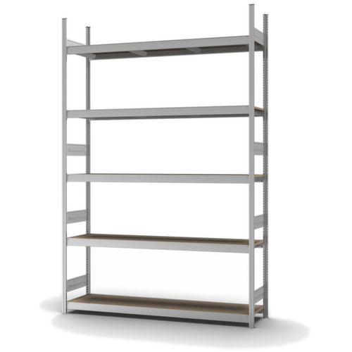 Die wichtigsten Maße des hofe Weitspannregals auf einen Blick:5 Ebene(n) mit Holzboden. Ebenen mit Verstärkung durch Unterzüge. Fachhöhen je nach Einsatzzweck und Ihrem Bedarf im Raster von 25 mm verstellbar. Nutzung einseitig - zur Aufstellung an der Wand konzipiert. Durch gesickte Tiefen-Verbindungsblechen und Stahl-Fußplatten ist das Regal besonders standfest. Obere Profilabdeckkappen sorgen für einen sauberen Abschluss. Konstruktion aus Stahl, Ständer mit korrosionsschützender Zinkbeschichtung, Traversen mit korrosionsschützender Zinkbeschichtung.